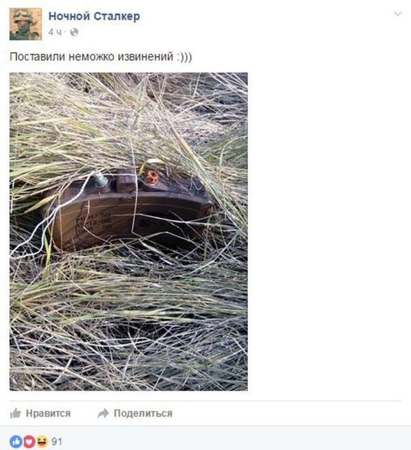 Всё началось с заявления Савченко. Она посоветовала боевикам Украины попросить извинений у жителей Донбасса. Ответили на это в Украине очень резко и теперь множество людей требуют лишить её звания героя Украины. Украинские силовики решили «извиниться», однако по своему: в траве они установили мину. На своей страничке в Facebook сапер выложил фото этой мины и подписал его «Немножко извинений». Ужасно то, что этого мужчину очень многие поддержали. Люди писали ужасные комментарии, к примеру: «Надо почаще так извиняться» и подобные.