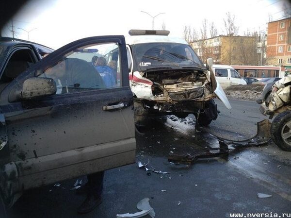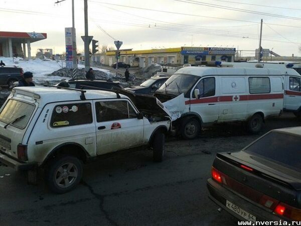 Авария была зарегистрирована после обеда сегодня, 26.02.15 на перекрестке просп.Строителей и ул.Антонова в Ленинском р-не города Саратова. Столкнулись три транспортных средства: «Киа Сорренто», «скорая помощь» и «Нива». В последнее авто отлетела «скорая» при столкновении с кроссовером.